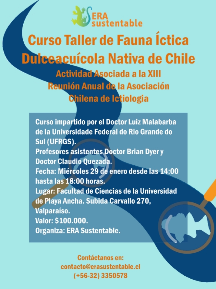 El curso, destinado a la promoción del conocimiento de la fauna íctica dulceacuícola nativa de nuestro país, su manejo y conservación, tiene un valor de inscripción de $100.000 y debe realizarse a través de nuestro correo electrónico: contacto@erasustentable.cl o a través de nuestro número telefónico (+56-32) 3350578.